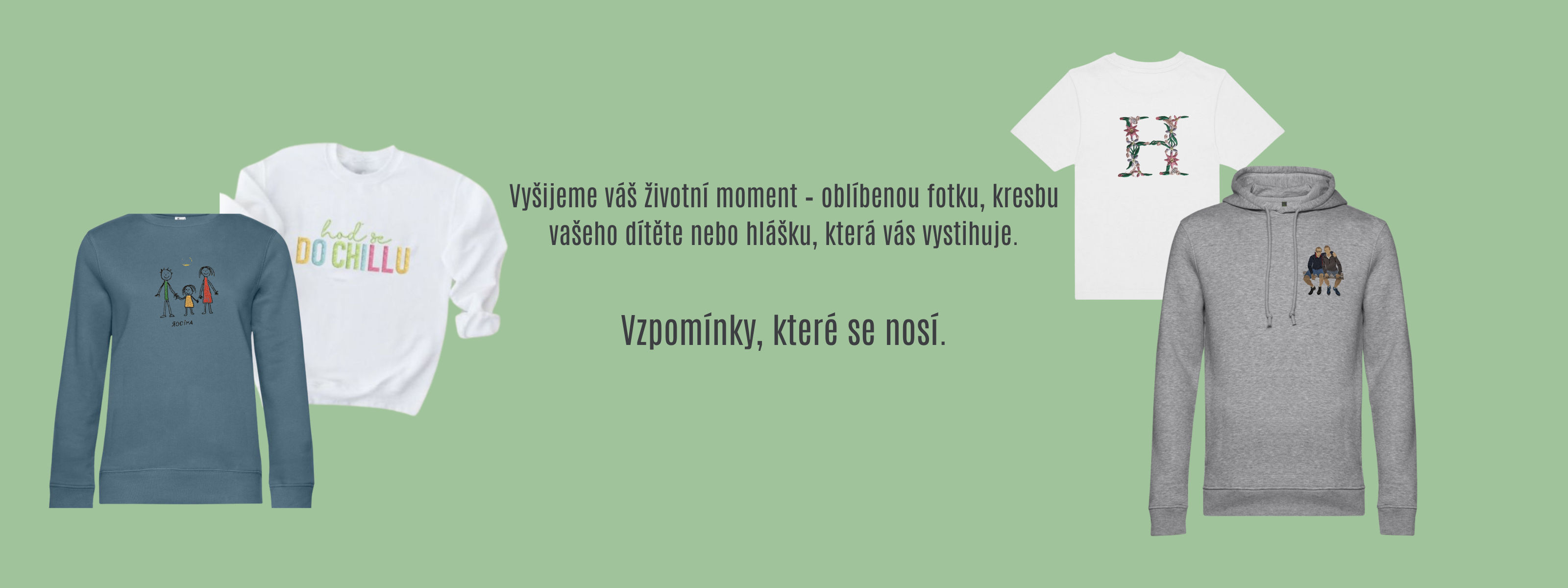 V e-shopu si vyberete oblečení, které se vám líbí. Zvolíte barvu, velikost a jaký motiv si přejete vyšít. Nahrajete svou fotku, obrázek, kresbu vašeho dítěte nebo napíšete text, který má být vyšit. Pokud máte speciální přání, napište nám – jsme otevřeni kreativitě.